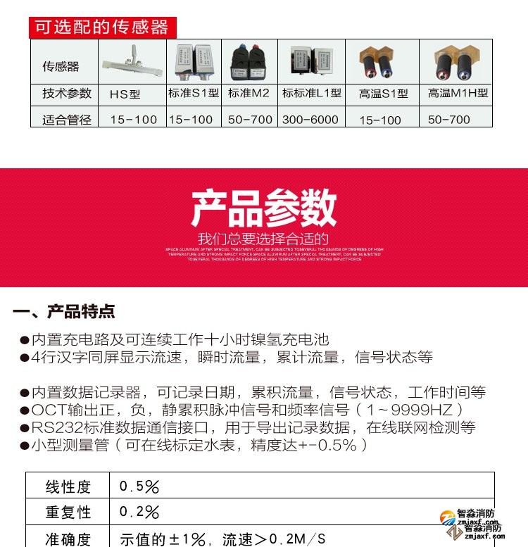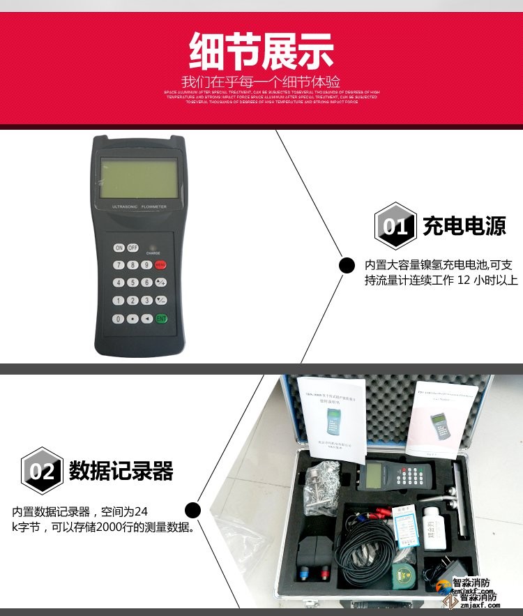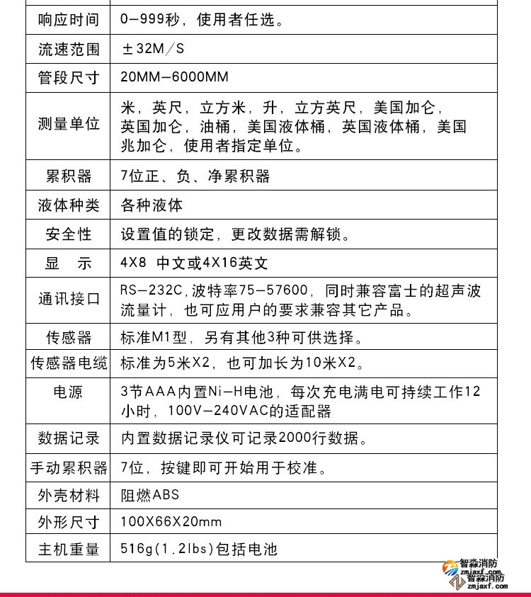 超聲波流量計(jì)測量管徑范圍:0mm~300mm;WWW.XFJCYQ.COM精度:±1%用于檢測消火栓系統(tǒng)和水噴淋系統(tǒng)的給水量以及消防豎管的流量分配。