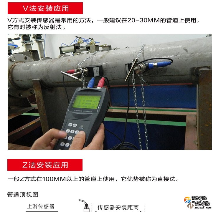 超聲波流量計(jì)的傳感器一般采用V方式和Z方式安裝,通常情況下,管徑小于300mm時(shí),采用V方式安裝,管徑大于200mm時(shí),采用Z方式安裝。對于即可以用V方式安裝又可以Z方式安裝的傳感器,盡量選用Z方式。實(shí)踐表明,Z方式安裝的傳感器超聲波信號(hào)強(qiáng)度高,測量的穩(wěn)定性也好,圖2。